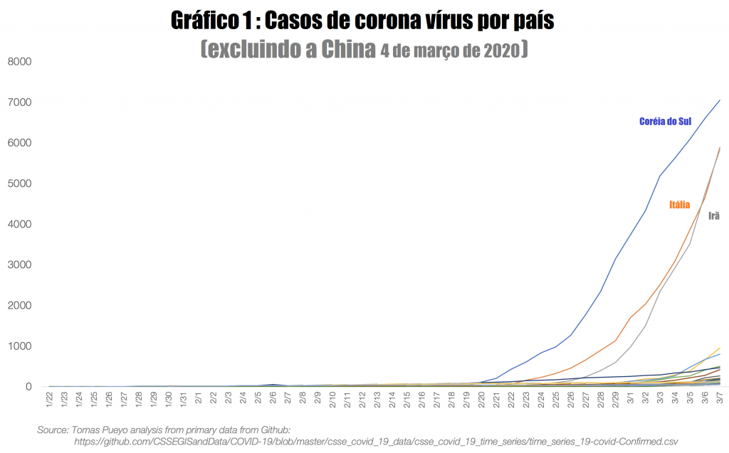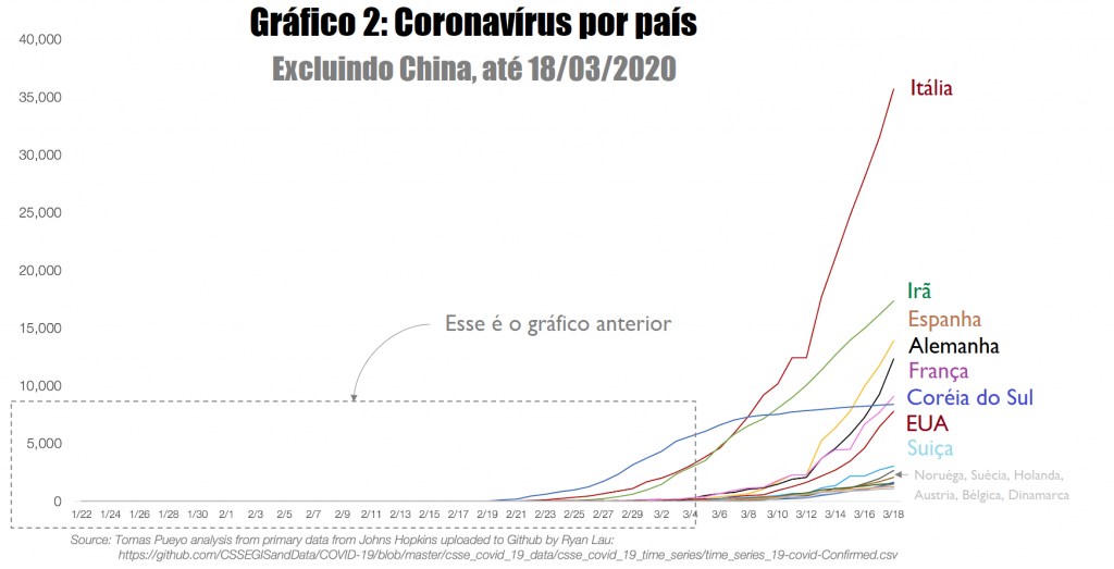 Ele mostrava casos de coronavírus em todo o mundo fora da China. Só conseguimos discernir bem a Itália, o Irã e a Coréia do Sul. Então tive que dar um zoom no canto inferior direito para ver os países emergentes. Meu argumento é que eles logo se juntariam a esses três casos.