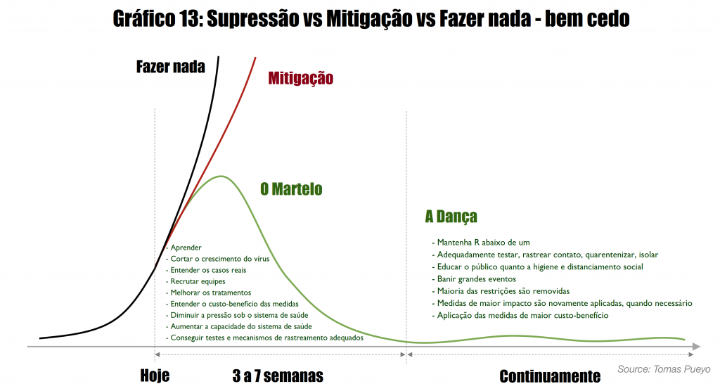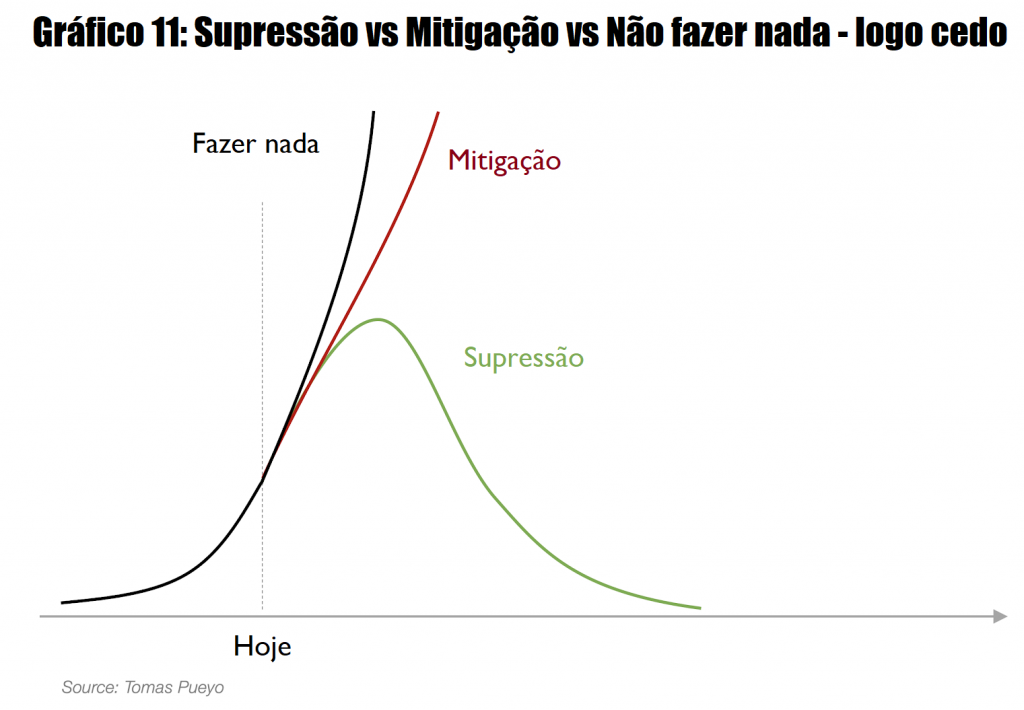 A estratégia de mitigação não tenta conter a epidemia, apenas “achatar a curva” um pouco. Enquanto isso, a Estratégia de Supressão tenta aplicar medidas pesadas para rapidamente controlar a epidemia. Especificamente: