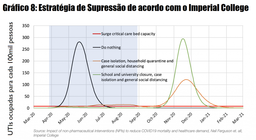 Com medidas de Supressão os diagnósticos positivos continuariam aumentando por algumas semanas, mas depois começariam a diminuir. Com menos casos, a taxa de mortalidade também passaria a cair. E o dano colateral também seria reduzido: menos pessoas morreriam por causas não relacionadas ao coronavírus, o que ocorre quando o sistema de saúde está simplesmente sobrecarregado.
