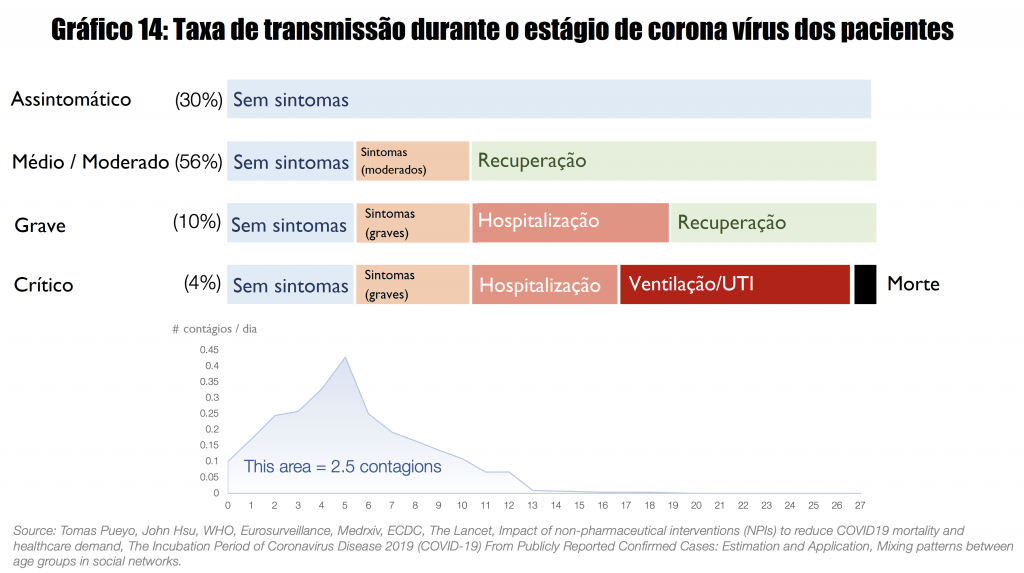 Todos os dias após a contração do vírus, as pessoas têm algum potencial de contágio. Juntos, todos esses dias de contágio somam 2,5 contágios em média.