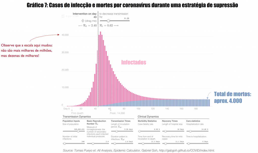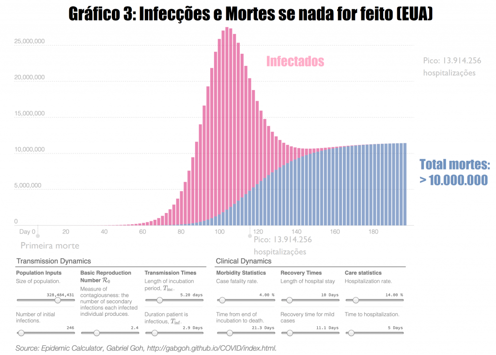 Se não fizermos nada: todo mundo é infectado, o sistema de saúde fica sobrecarregado, a mortalidade explode e aproximadamente 10 milhões de pessoas morrem (barras azuis). Numa conta simples: se aproximadamente 75% dos americanos são infectados e 4% morrem, são 10 milhões de mortes, ou cerca de 25 vezes o número de mortes de americanos na Segunda Guerra Mundial.