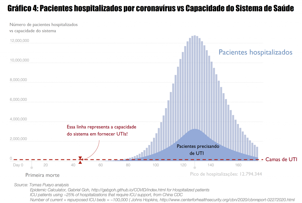 Há 4 milhões de internações em UTI nos EUA todos os anos, e 500 mil (aproximadamente 13%) deles morrem. Sem leitos de UTI, essa participação provavelmente se aproximaria de 80%. Mesmo que apenas 50% venham a morrer, em uma epidemia de um ano, você passa de 500 mil mortes por ano para 2 milhões, adicionando 1,5 milhão de mortes, apenas de danos colaterais.
